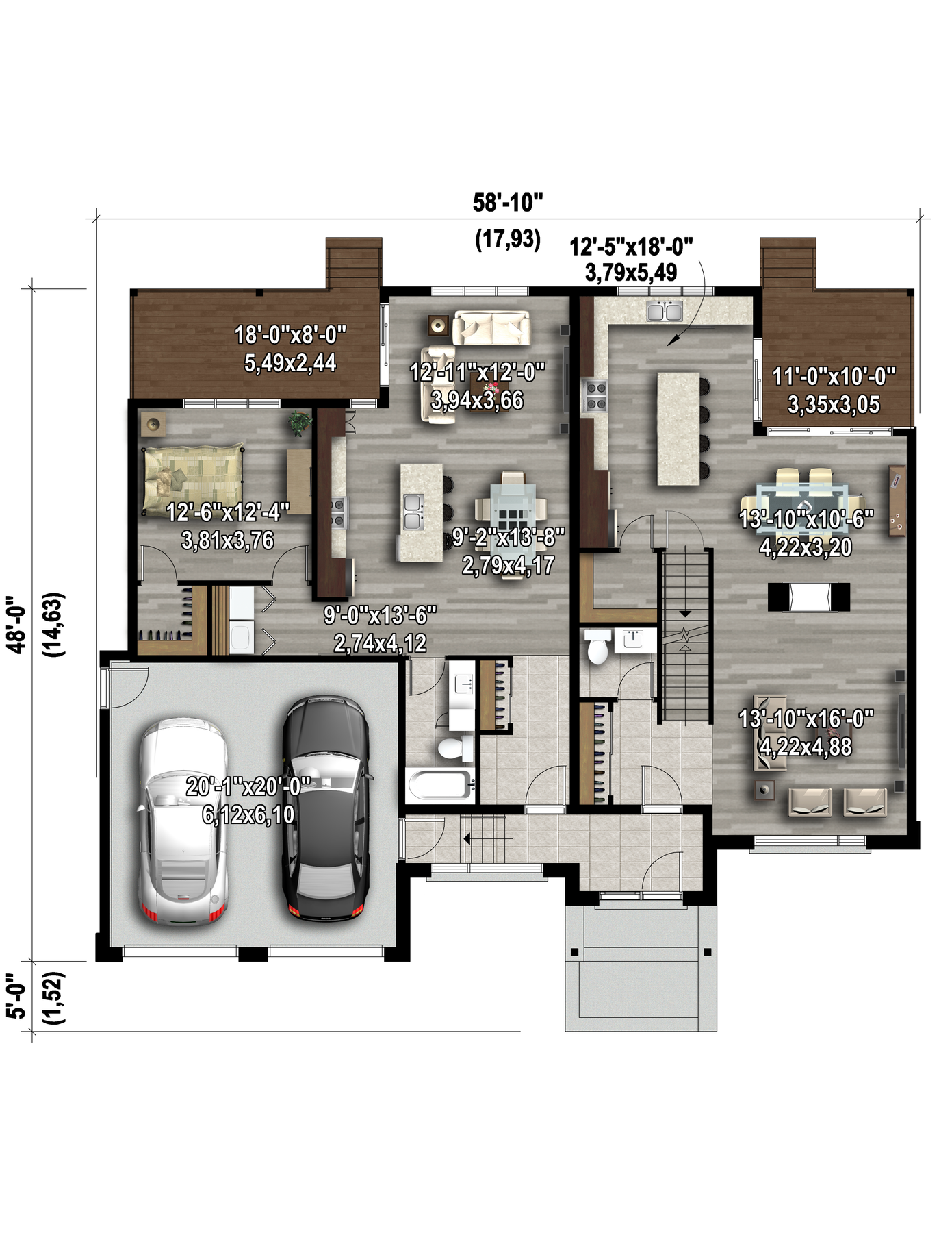 From the outside, this house looks like a single-family home clad in brick and wood, however it's really an intergenerational house made of two distinct units. The home is 58 feet 10 inches wide by 48 feet deep, and has a total living area of 2,713 square feet, including a 459 square-foot two-car garage.