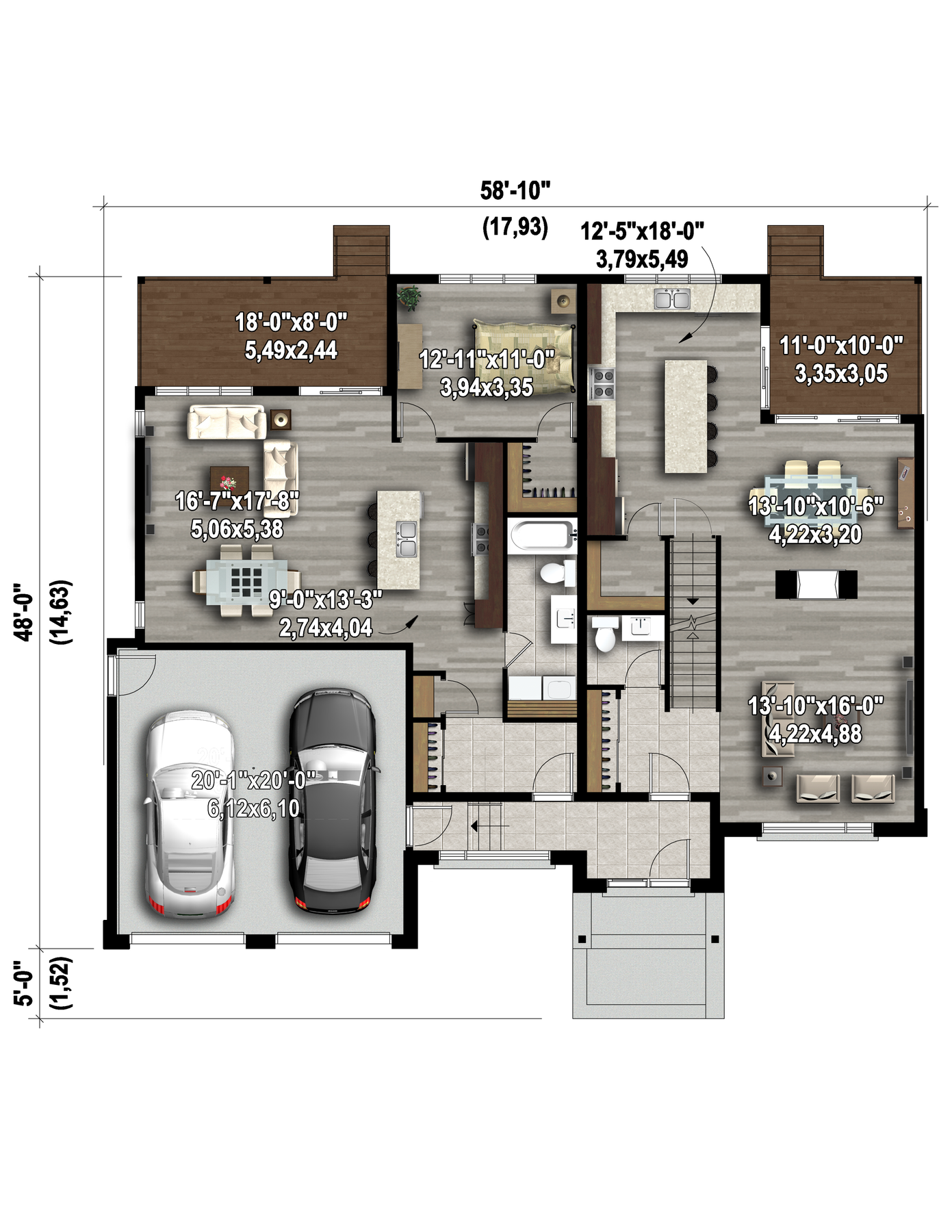 Parents and children will enjoy living under the same roof in this brick and wood intergenerational house consisting of two distinct units. The home is 58 feet 10 inches wide by 48 feet of clad in aluminum, stone and brick, clad in aluminum, stone and brick, clad in aluminum, stone and brick, ep, and has a total living area of 2,713 square feet, including a 459 square-foot two-car garage.