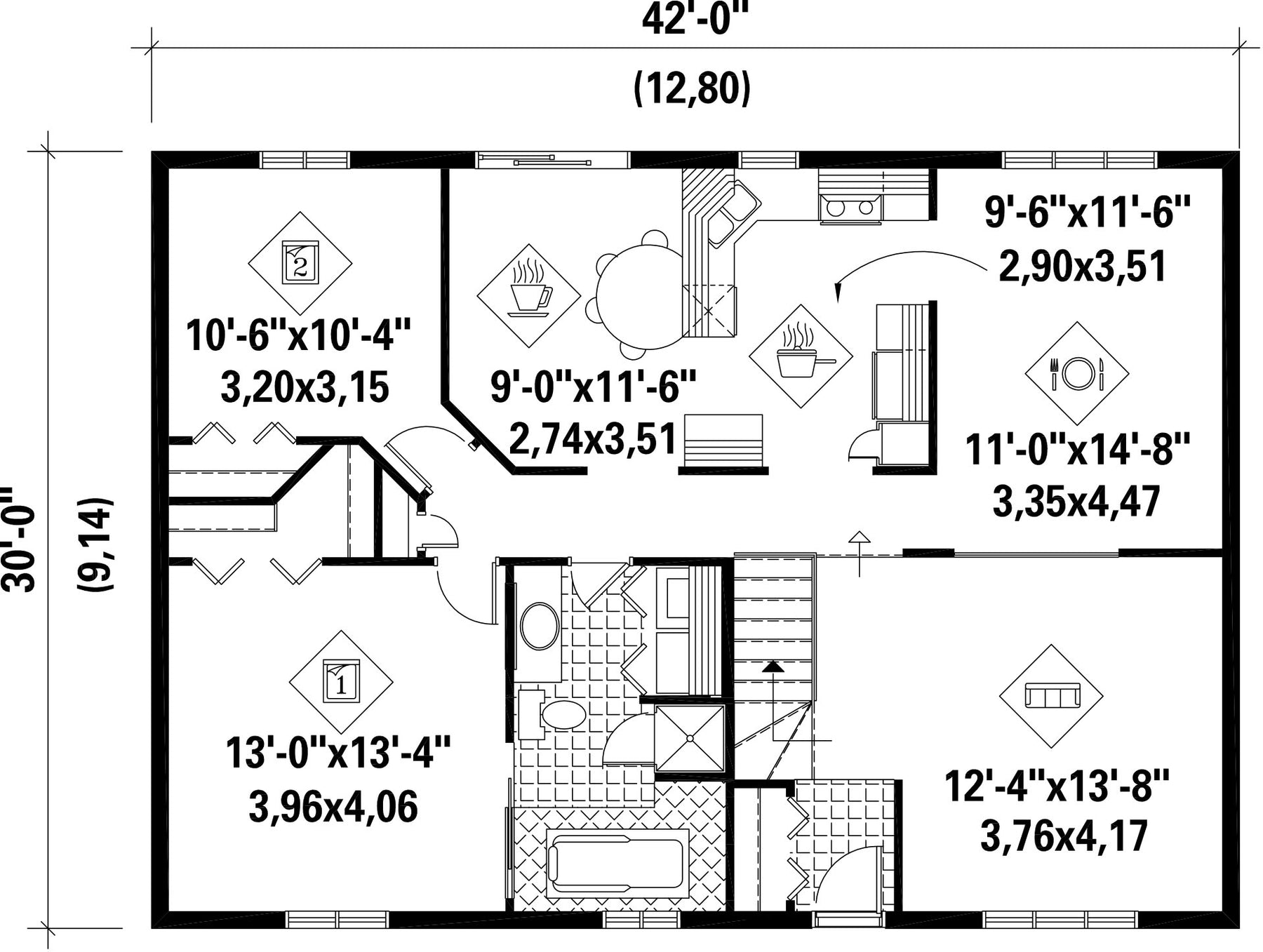 | Front | 42 ft | Total living surface | 1260 ft² |