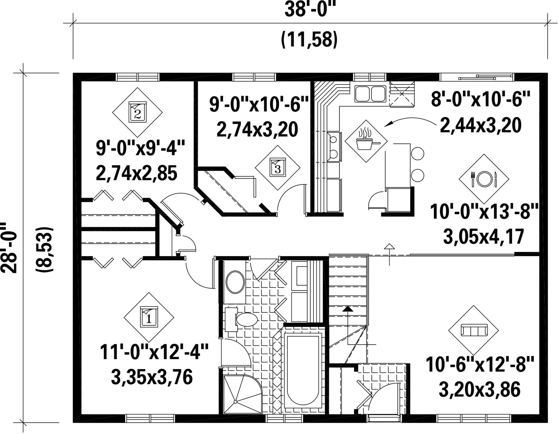 | Front | 38 ft | Total living surface | 1064 ft² |