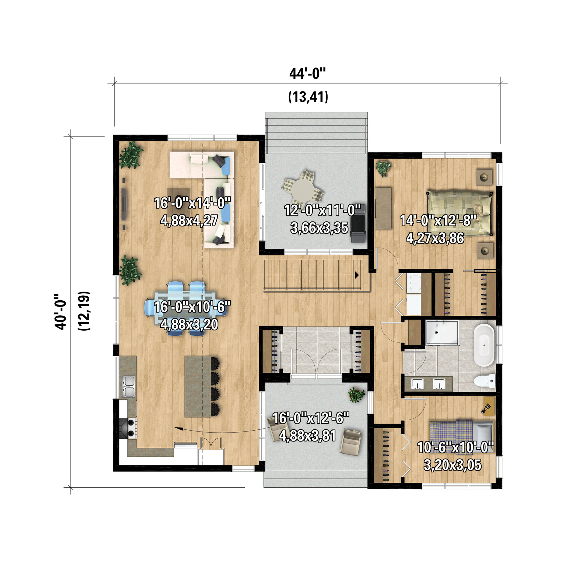 | Front | 44 ft | Total living surface | 1396 ft² |
