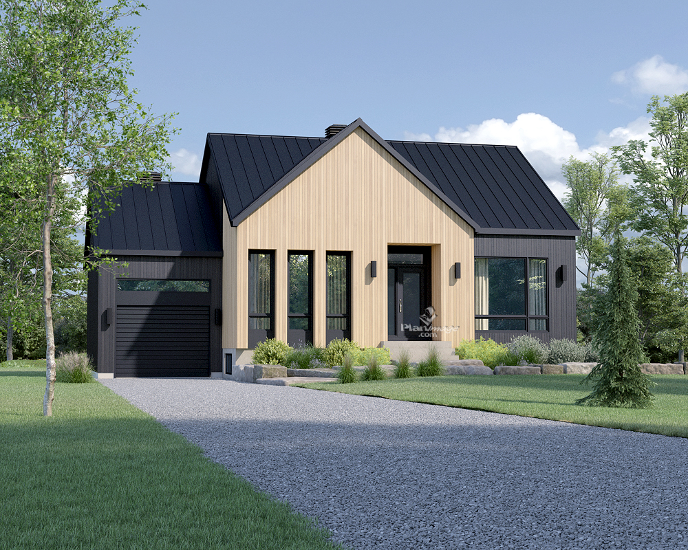A single-storey European-styled house with many windows. This house offers a livable surface area of 1,078 sq. ft. and has two bedrooms, a complete bathroom as well as an open-concept area with a living room, a dining room and a kitchen with a four-person island. The one-car garage has a surface area of 288 sq. ft. The laundry room is also on this floor but it can be moved to the basement.
