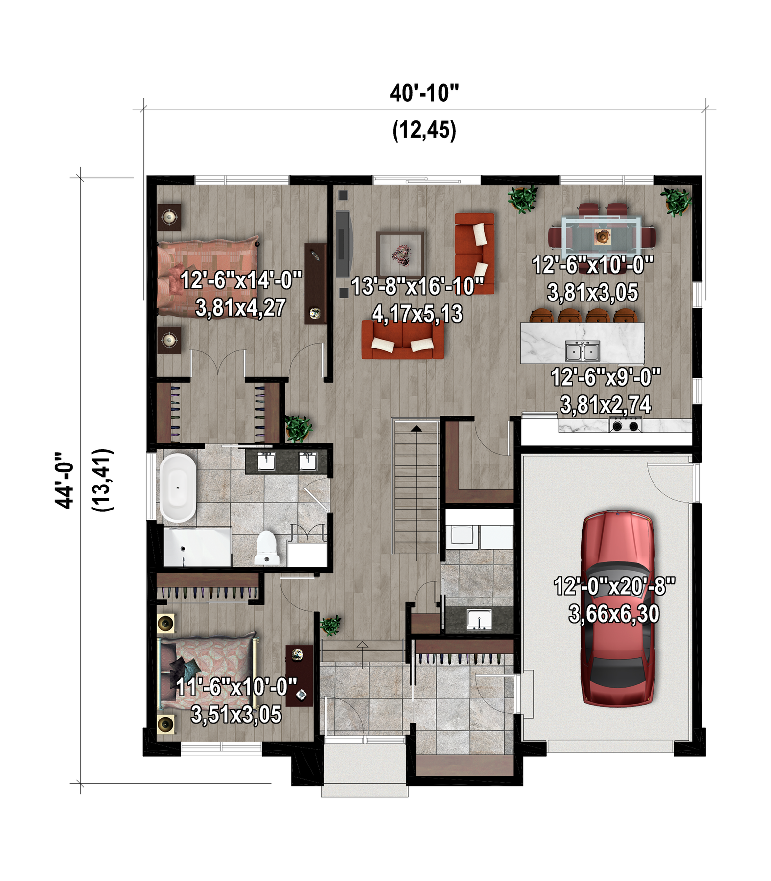 This large house is 40 feet wide by 44 feet deep with a livable area of 1405 sq. ft. The house has two large bedrooms, an open-concept kitchen with a four-person island, a dining room and a living room. The garage has room for one car and provides access to the vestibule. A laundry corner is also included.