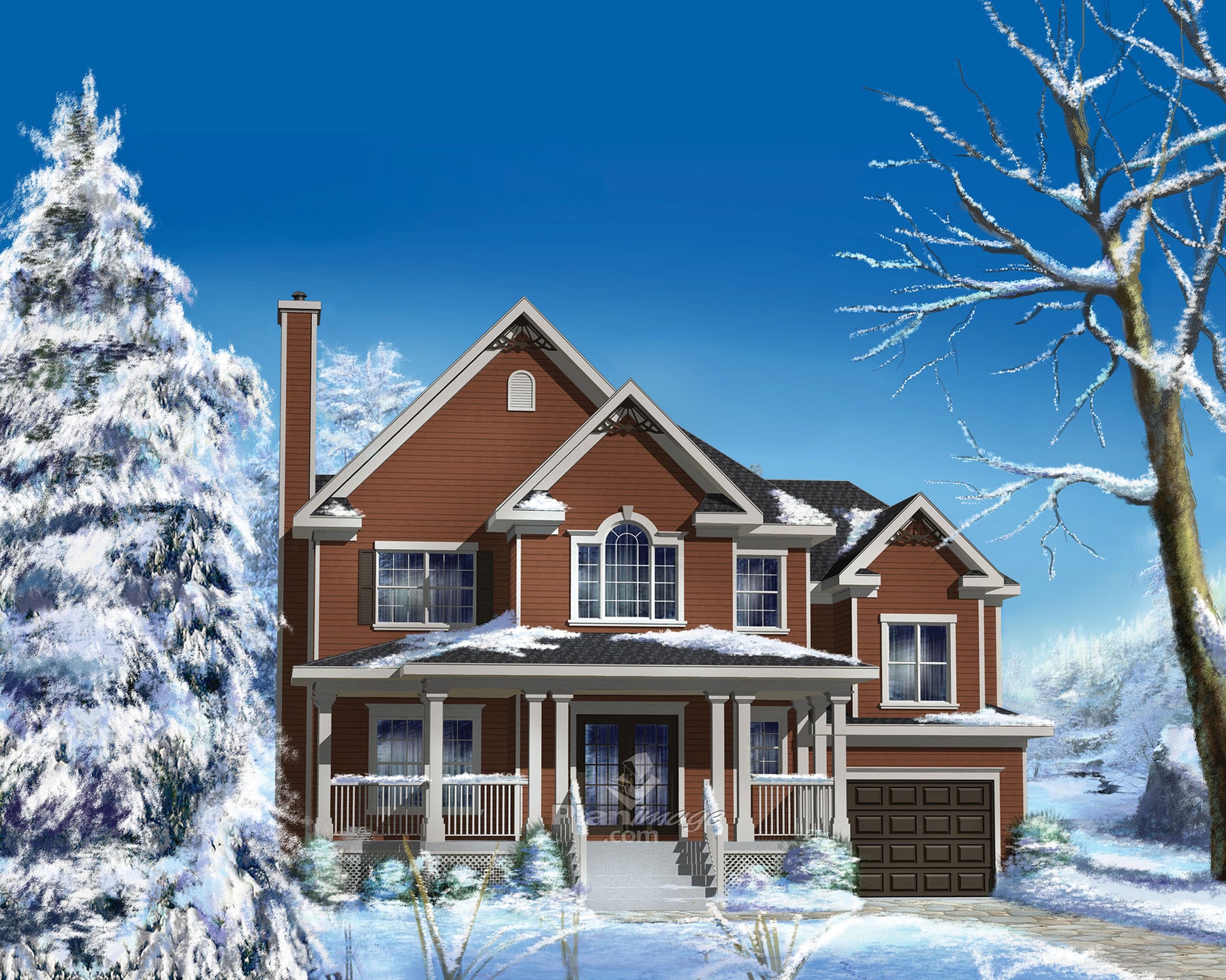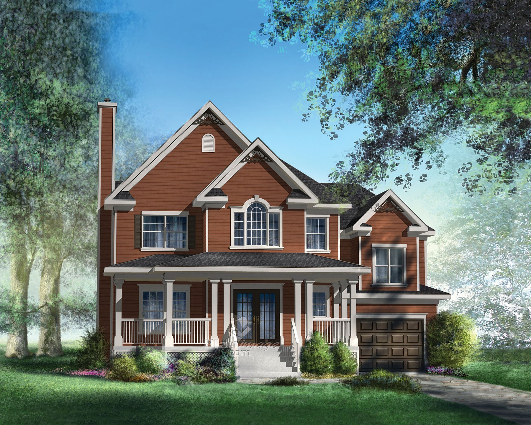 This attractive two-storey house features several architectural details such as a large front porch with decorative posts, roof gables of various dimensions and decorative moldings. The home is 43 feet 6 inches wide by 37 feet deep and provides 2,245 square feet of living space.