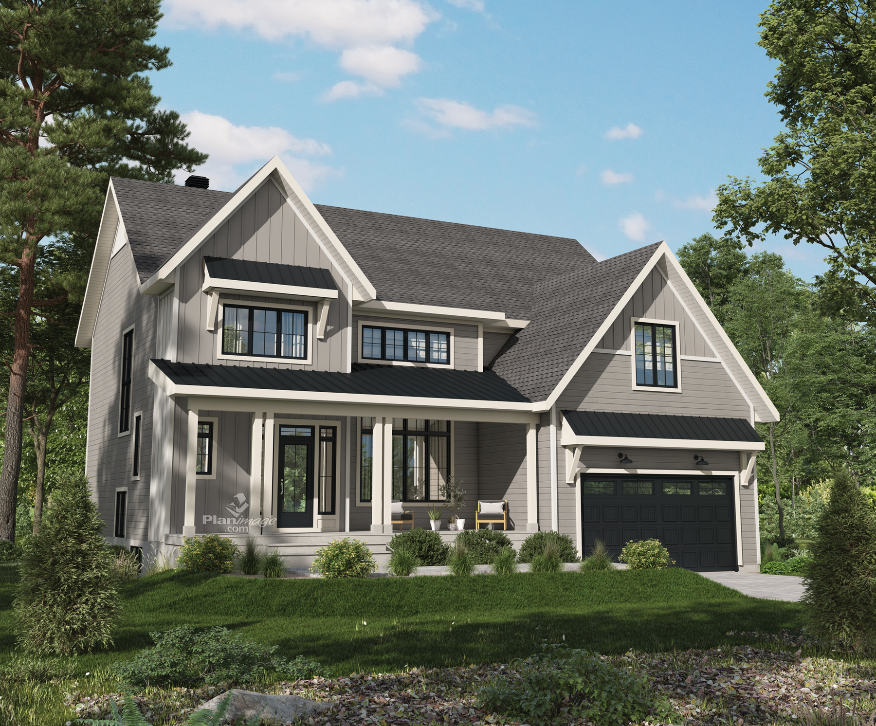 The pleasant mix of colors and the ample fenestration will certainly catch your eye. A large porch with beautiful white columns gives this two-storey house with a two car garage a Farmhouse look. It is 50 feet wide and 44 feet deep with a livable surface area of 3187 sq. ft.