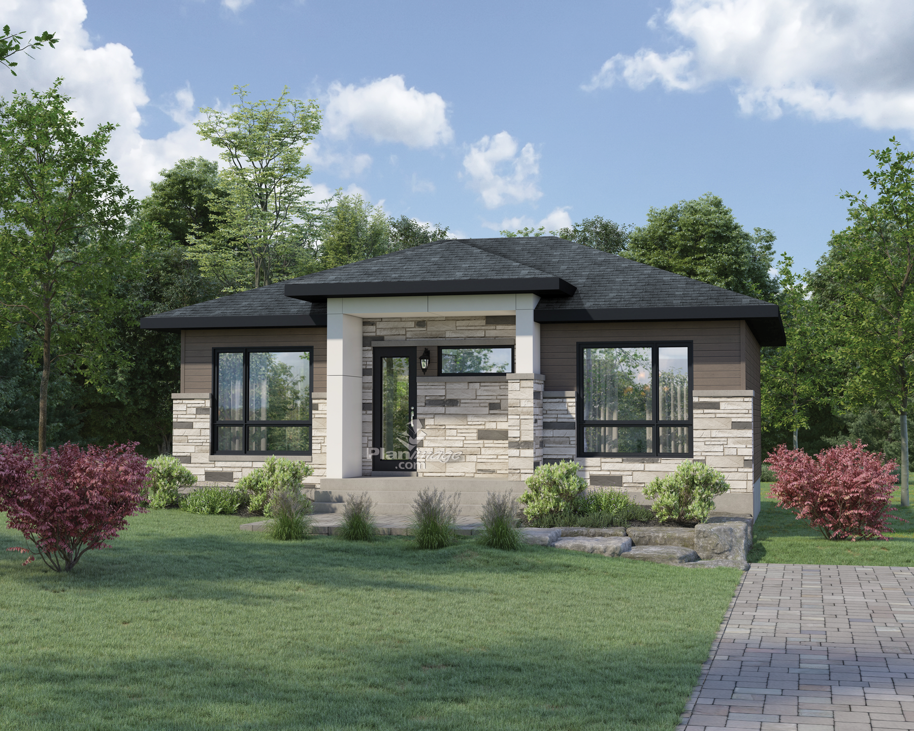 Un plain-pied avec beaucoup de fenestration ayant une chambre à coucher avec une grande garde-robe walk-in. La superficie habitable est de 988 pi². Les pièces sont à aire ouverte. Dans la cuisine on retrouve un garde-manger walk-in. Il y a un espace soit pour un bureau de travail soit pour un coin lecture. Il y a aussi une grande salle de bain complète avec bain et douche séparés.