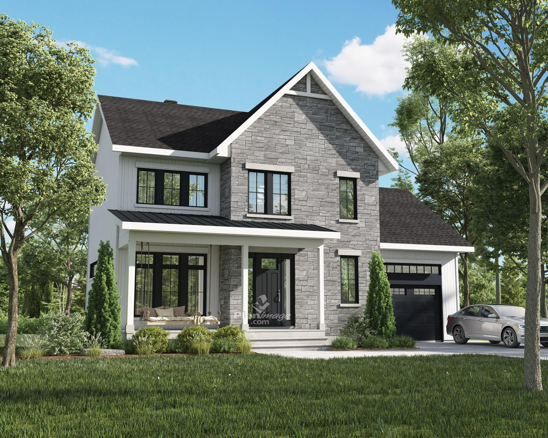 Une magnifique maison à étage avec son mélange de pierre et de bois, une belle véranda à l’avant et beaucoup de fenêtres. Elle mesure 44 pieds de largeur sur 30 pieds de profondeur pour une superficie habitable de 1 718 pieds carrés. Le rez-de-chaussée de 854 pieds carrés à aire ouverte compte un vestibule, une salle d’eau, un salon, une salle à dîner et une cuisine avec un îlot et un comptoir en L. Un vaste garde-manger complète la cuisine.