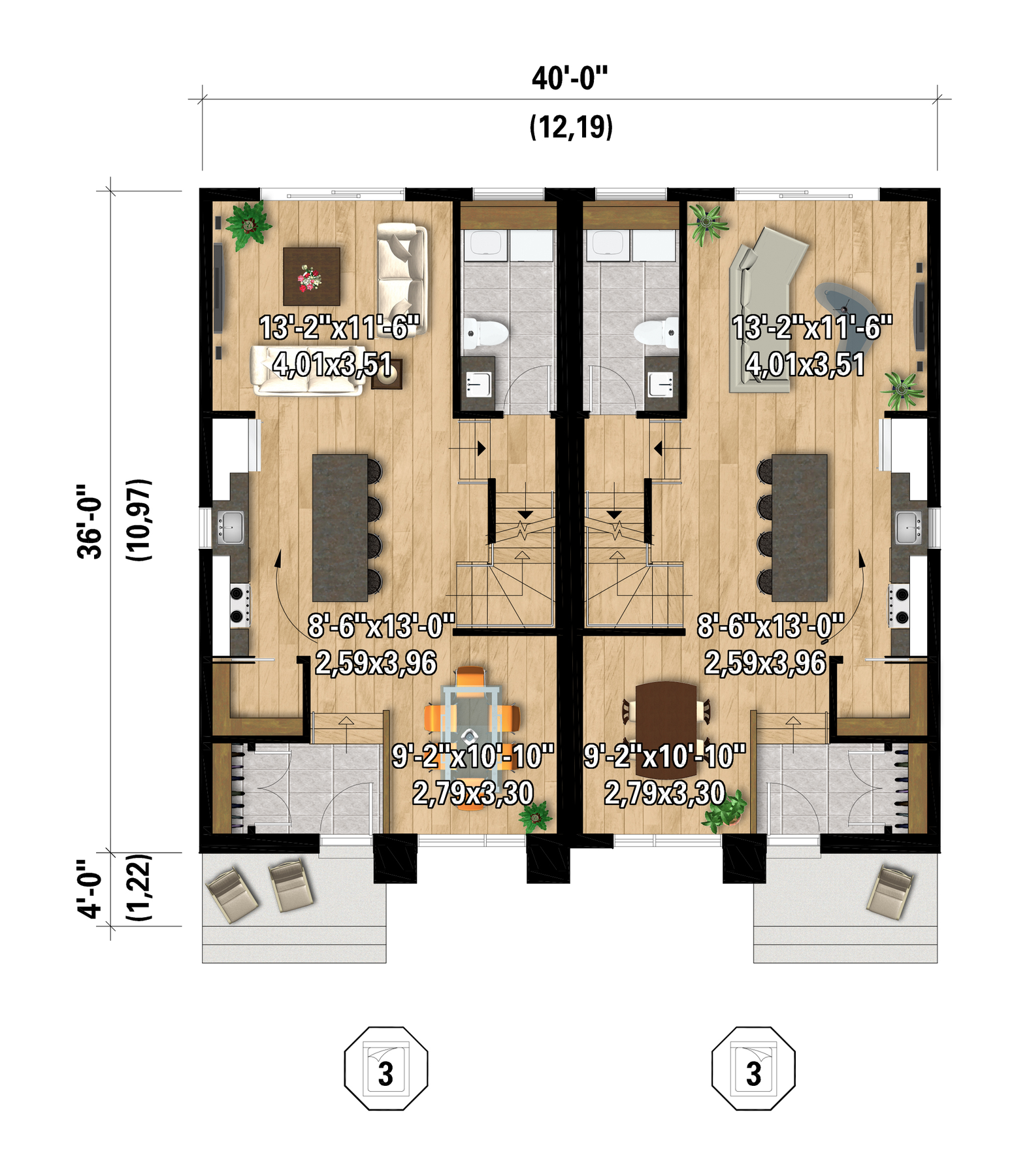 Ce jumelé de style Européen est différent de par son apparence extérieure. Les unités sont identiques et ont une superficie habitable par étage de 716 pi². Le rez-de-chaussée est à aire ouverte. Dans la cuisine il y a un îlot pour quatre personnes et un garde-manger walk-in ainsi qu’une salle d’eau avec entrée pour laveuse-sécheuse. Les trois chambres à coucher se trouvent à l’étage et elles se partagent une salle de bain complète. À noter que la chambre principale a une garde-robe walk-in.