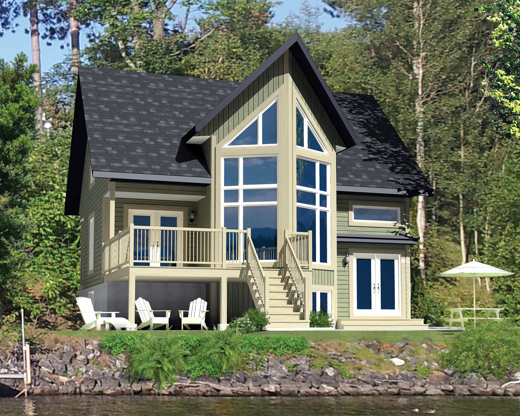Ce chalet de style Cape Cod est idéal pour les familles qui aiment le plein air. Il mesure 34 pieds de largeur sur 32 pieds de profondeur et occupe une surface habitable de 1 461 pieds carrés.
